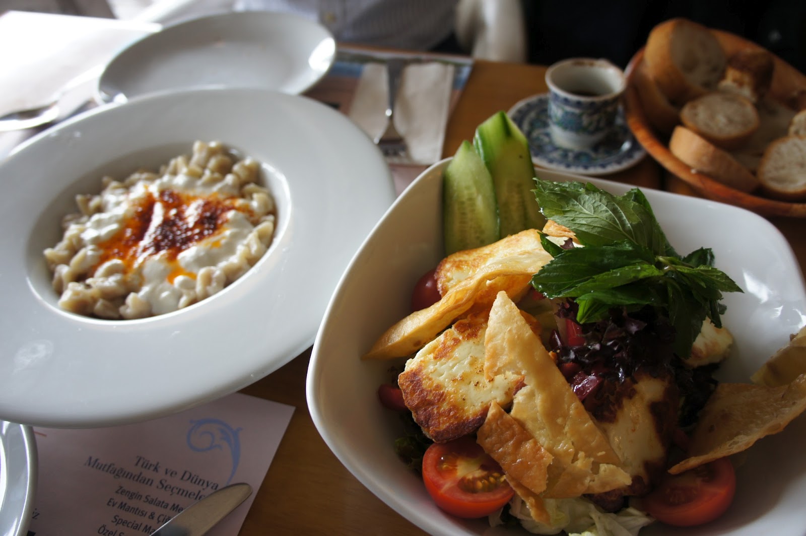 左邊是土耳其人的常見食物之一,很小很小的餃子蠶豆大小,裡面包肉,淋上優格